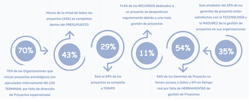 Indicador 1 = 70% de las organizaciones que inician proyectos estratégicos ejecutados internamente, NO los terminan, por falta de dirección de proyectos calificada, y no lograr compromiso de los Stakeholders